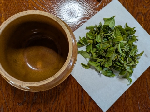 雨岳文庫の茶の冬芽を少し摘ませていただき、陶器で炒ってみました。以前、雨岳文庫の