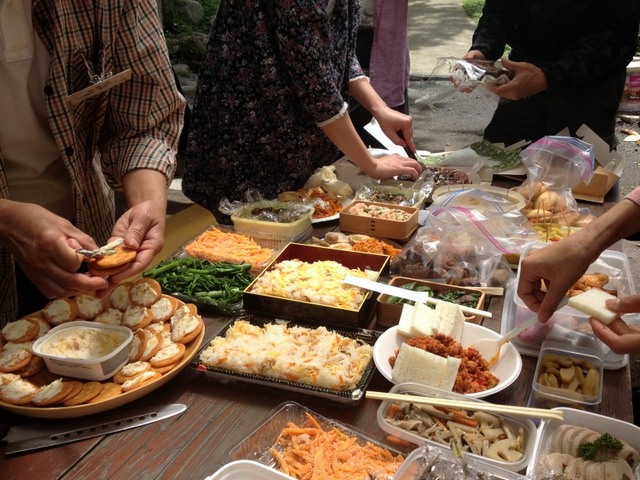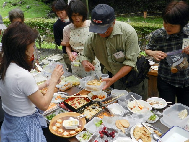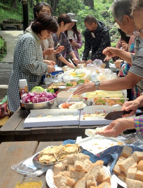 当日は、発泡性の麦飲料を持参してくださった方や、ワイン等でも盛り上がりました。過去5回の「雨岳ランチ」に触発された受講生たちが手作りのおいしいもの持参で、ご馳走がたくさん集まりました。皆様の御協力に感謝いたします。