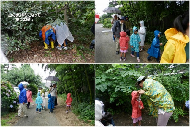 小雨の降る中、梅林に探検隊が出発しました。子ども達は、虫の気持ちになっておいしそうな草を探して歩きます。