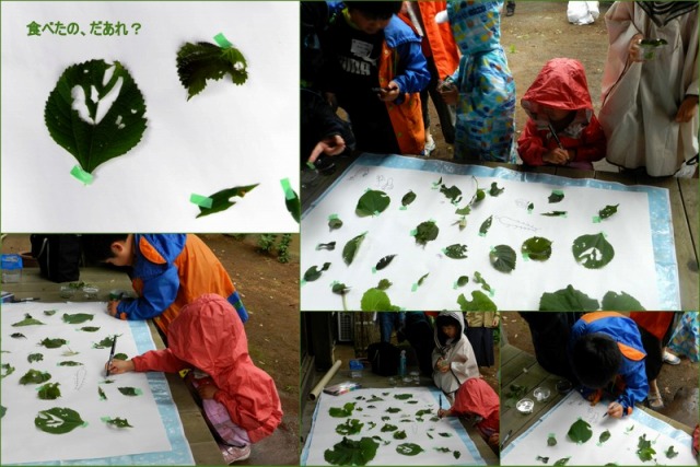 虫さん達の食べかけの、おいしそうな葉っぱを見つけて、模造紙の上に貼り付けました。虫の気持ちになって語り合いました。