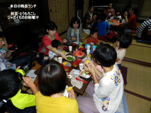 虫さん達がたくさん食べていたので、探検隊たちもお昼にしました。雨岳ランチは、採れたて「えだまめ」「とうもろこし」「すいか」でした。みんなで食べるとおいしいね