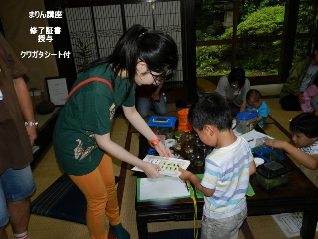 虫さんたちと上手にお友達になりました!と、まりん先生より修了書とクワガタシールをいただきました。