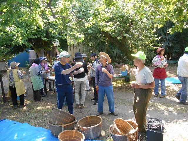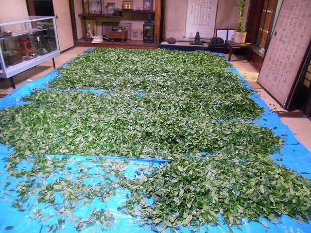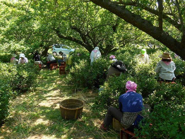 今年も近所の方においでいただいて、雨岳文庫の自園茶畑でお茶摘みをしました。雨岳自然の会によるお茶摘み体験も並行して行われました。赤いスカーフのベテランさんが初心者に昔からの手摘みの茶摘みを伝授しました。90Kg以上摘むことが出来ました。このうち75Kgを製茶のためにわさびや茶園に運びました。残りは明日摘みます。