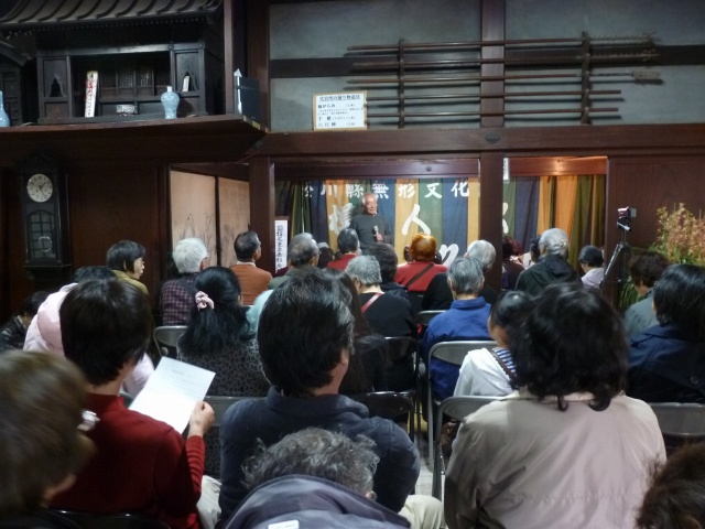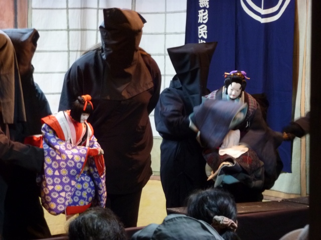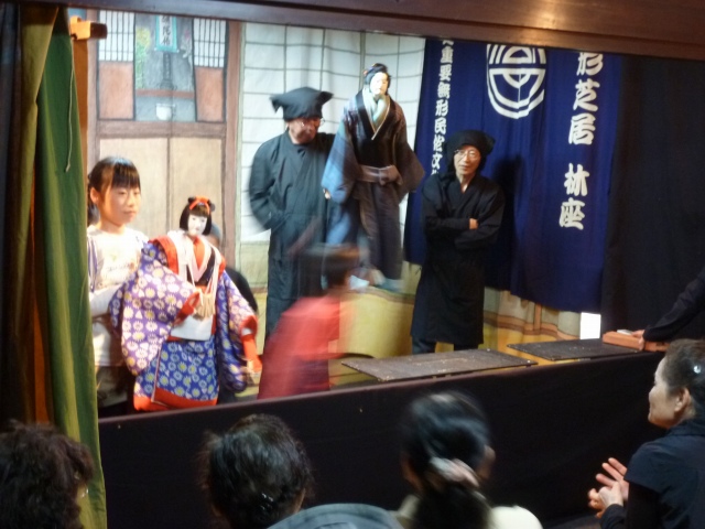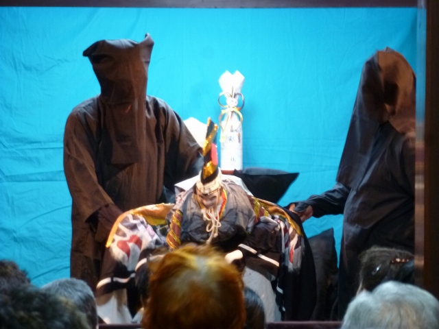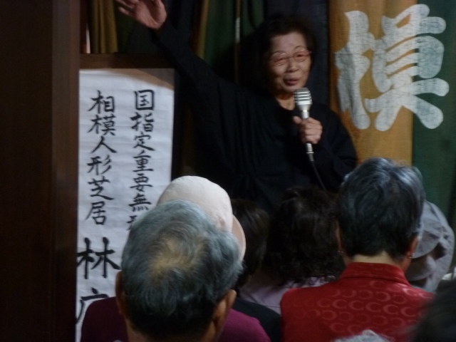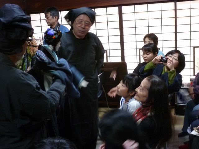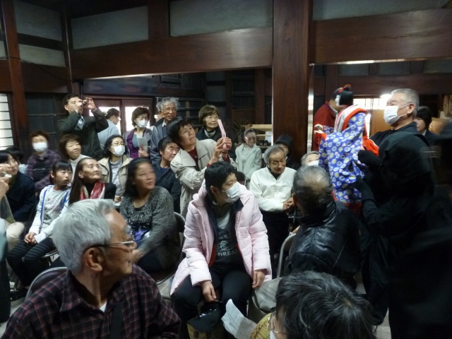 今日は雨岳文庫の母屋で恒例の厚木「林座」による相模人形芝居(国の重要無形文化財)の公演がありました。”三番叟”上演の後人形とふれあいがあり、最後に”傾城阿波の鳴門”の上演がありました。