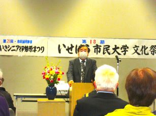 好天に恵まれた暖かい2月12日(日)、いせはら生涯学習ボランティア協会(略称「学ボラ」)といせはら観光ボランティアガイド&ウォーク協会と共催する「シニアいきいき祭り」が150名以上の観衆を集めて中央公民館で開催された。 このシニア祭りは20回目を数え、長い歴史を感じさせられる。プログラムは第1部「主催者挨拶」 第2部「市民大学生文化祭」 第3部「傘下団体活動発表(スマイルクラブ、友遊庭そして甲冑隊)」最終第4部「地元歌手 小倉恵子さん歌唱ショー」と賑々しく披露され大喝采を浴びていた。 特に市民大学第18期の今年は第11回目の開催回数となり、終了式を含め残り2回となった。そんな事情も関連したか否か、初めての実施「市大生文化祭」は、当初、皆さんが参加に違和感を覚えていたが全7班約50名が合同チームで次の内容を披露した。1.歌唱、ギター伴奏 2.お楽しみ 3.歌とハーモニカ演奏 4.言葉あそび 5.マジックショー