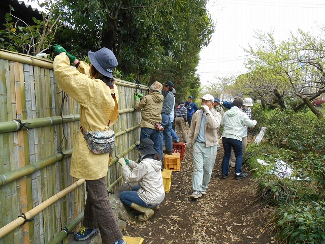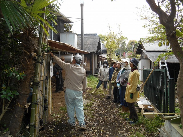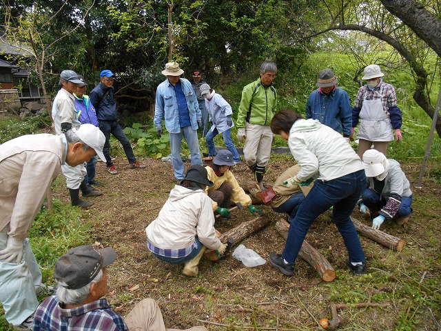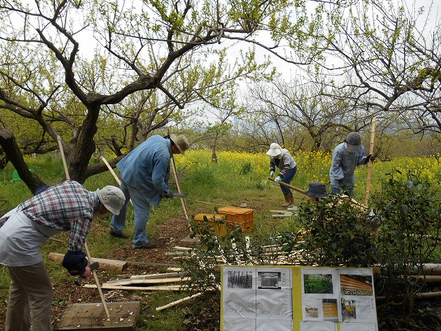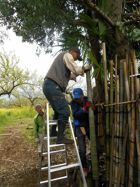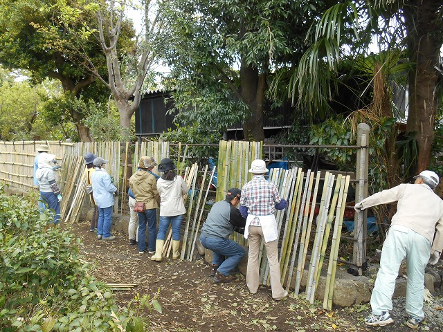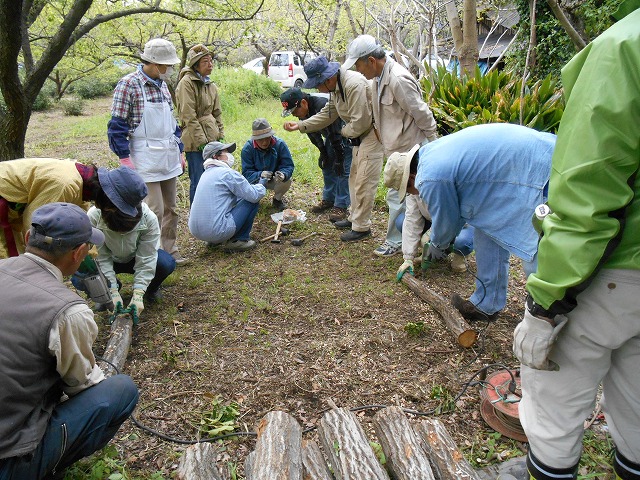 竹垣つくり体験学習会でたくさんの竹が残ったので、これを活用してその復習会を東京農大オープンカレッジのみなさんで行いました。さらにシイタケの菌打ちも行いました。