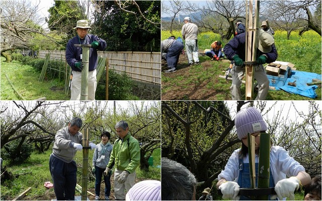 立子の裏と表側に人を配置し、20番の針金で横柱に巻きつけてゆきます。