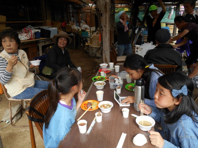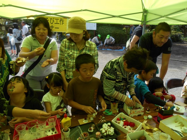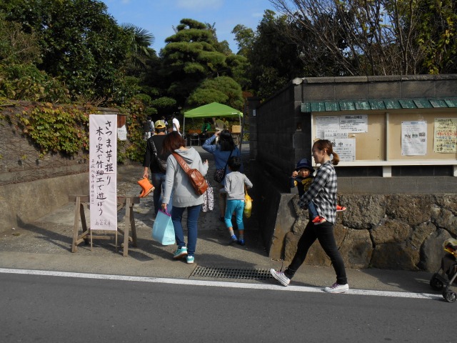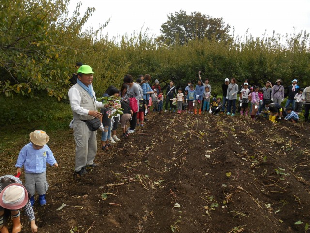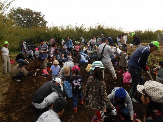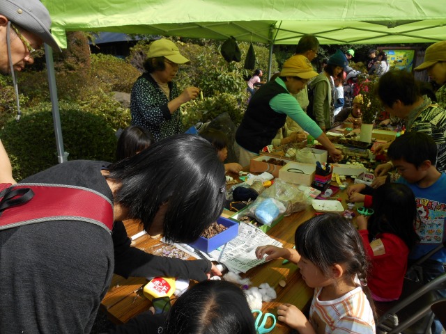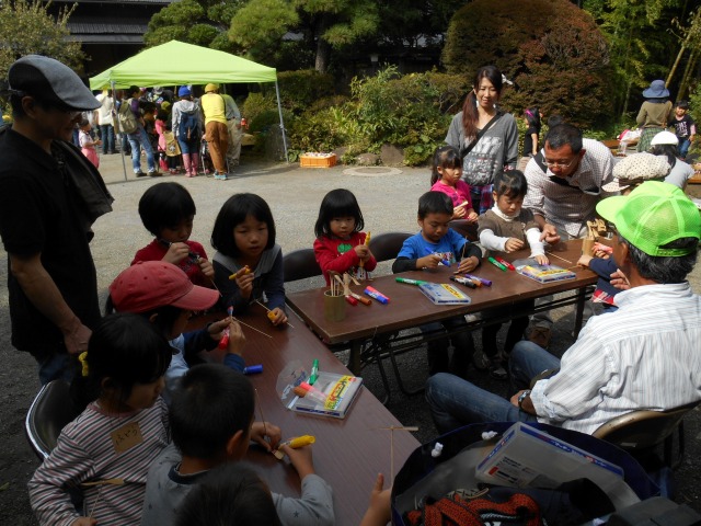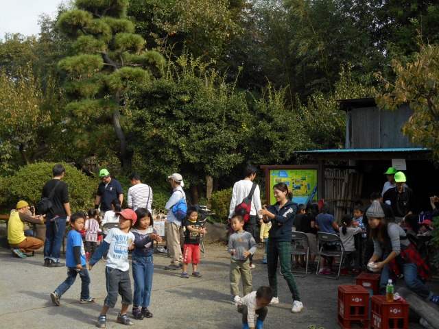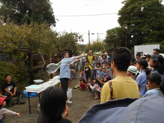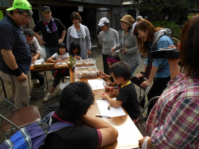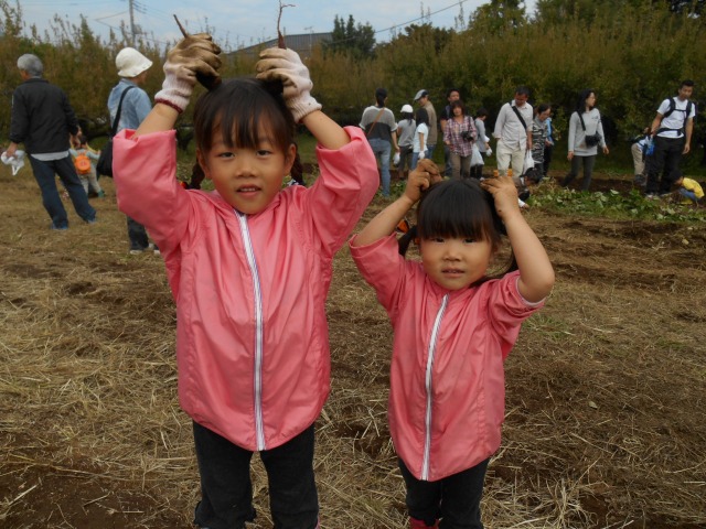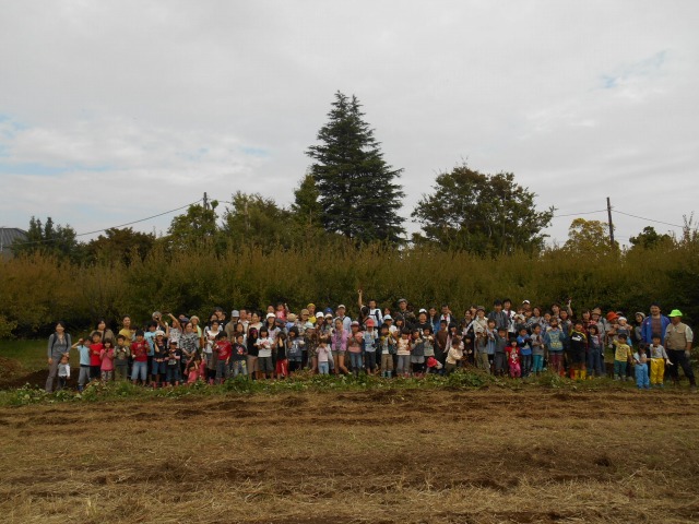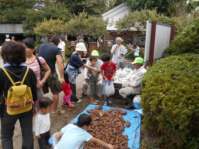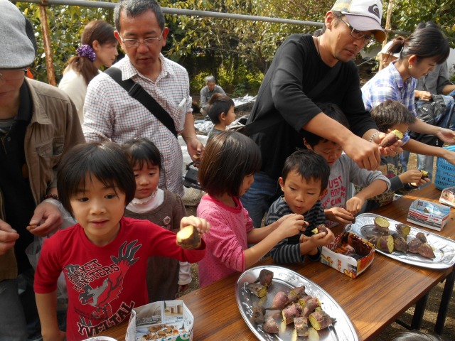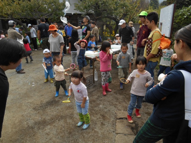 今年も”家族そろって収穫祭”が雨岳文庫で開かれました。43家族133名(招致客を含む、子供65名)にスタッフ37名でさつま芋ほりをし、シャボン玉飛ばし(伊勢原市立こども科学館)、木の実のクラフト作り(グリーンインストラクター;5名)、木の実細工(伊勢原市立こども科学館)、スーパー竹とんぼ飛ばしなどで遊びました。おやつに焼き芋、焼きナス、焼き落花生、焼き銀杏、ひょっくり芋、芋羊羹、など、昼食にはトン汁やカボチャのスープ、芋蔓のつくだ煮、こんにゃくの田楽、大根と茄子の漬物など盛りだくさんでした。