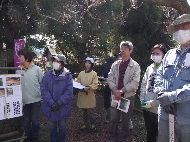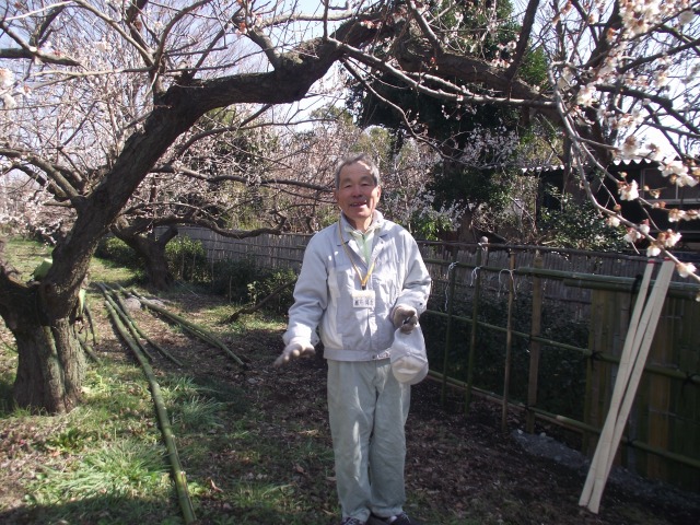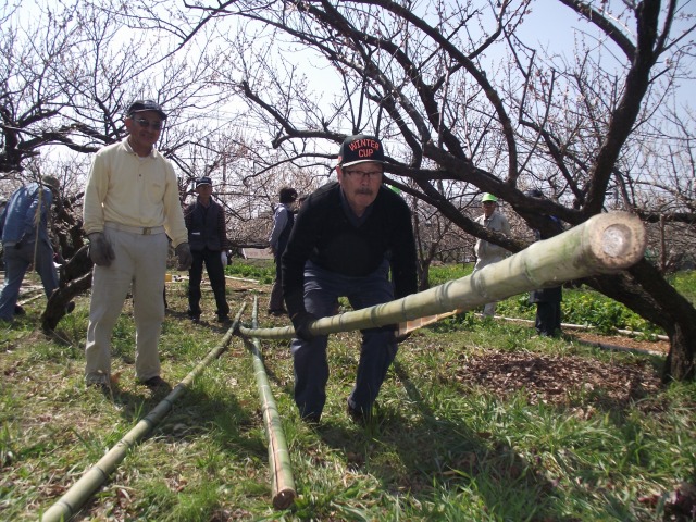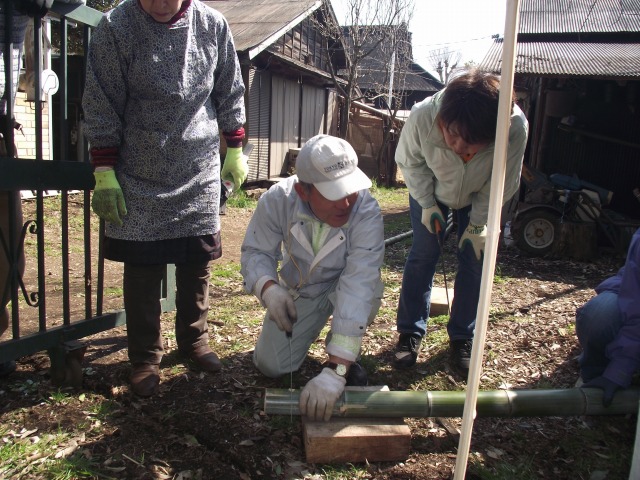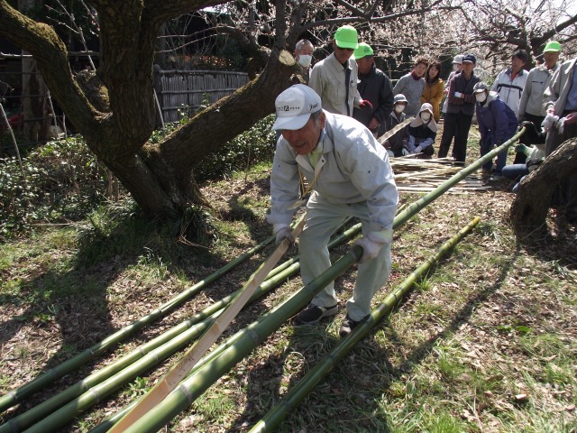 春色フェスタ最終日、梅林で竹垣つくりの体験学習会が開かれた(協力;東京農大オープンカレッジ)。真竹と孟宗竹の玉切り、竹割とふし・バリ取り、棕櫚縄の結び方、建仁寺垣の作り方などを学びました。胴ぶち用の長い竹を裂くノウハウなど貴重なものでした。