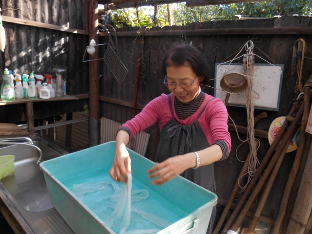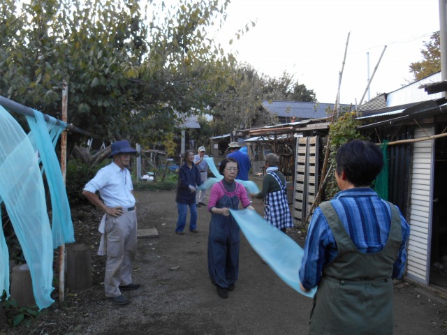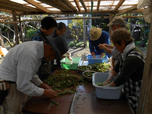 東京農大オープンカレッジの卒業生たちが午後集まり、生藍染のリハーサルをやっていました。