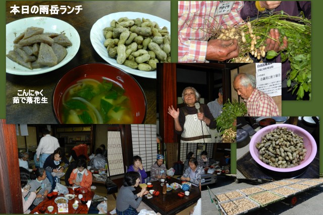 手作りこんにゃくの煮物、茹で落花生、ジャガイモ・玉ねぎ・菜の花のお味噌汁。