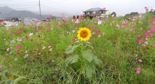 けなげに残ったヒマワリと、コスモスとの秋畑