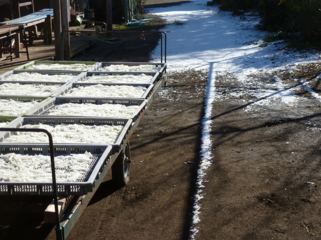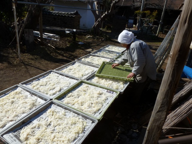 1月28日 夕べは、宵の内は晴れていたにも係わらず、雪が降りました。一応予報を信じて、切干大根は取り込んでおきましたので、ぬれることはありませんでした。早速朝は、外に出して、一日干し、今夜は晴れらしいので、夜干しして凍らせる事にしました。大根はこの寒い時期を外すとうまく干せません。凍るのも良く、カビも生えない。ただ、鳥は来る。