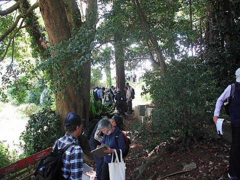 グループがいて、左手に、孔子廟ゆかりの楷(カイ)の木が立ち、すぐ下方に岡崎七ツ池の