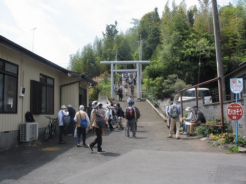 腰取神社入口の参道正面に立つ鳥居。その下方左側の大句自治会館。同会館左側に、岡崎七つ池の一つの福寿池があります。ここで小休憩をとりました。