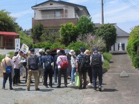 乙女地蔵が安置されている、芳圓寺前の広場。見学中の第1グループ。担当が小道具を使って、由緒を物語り中です。