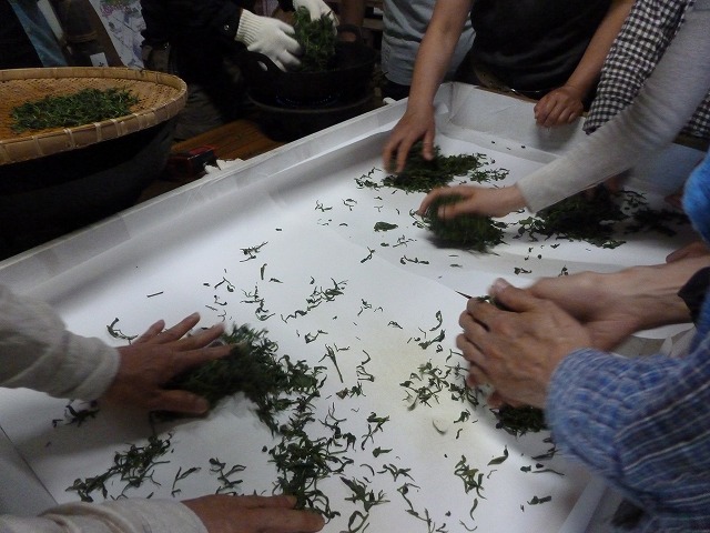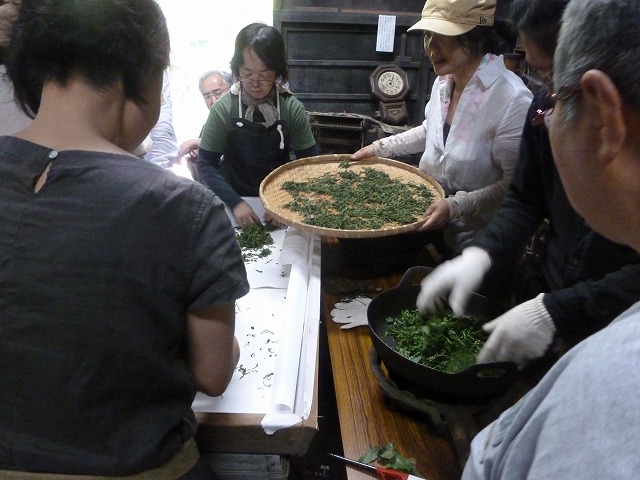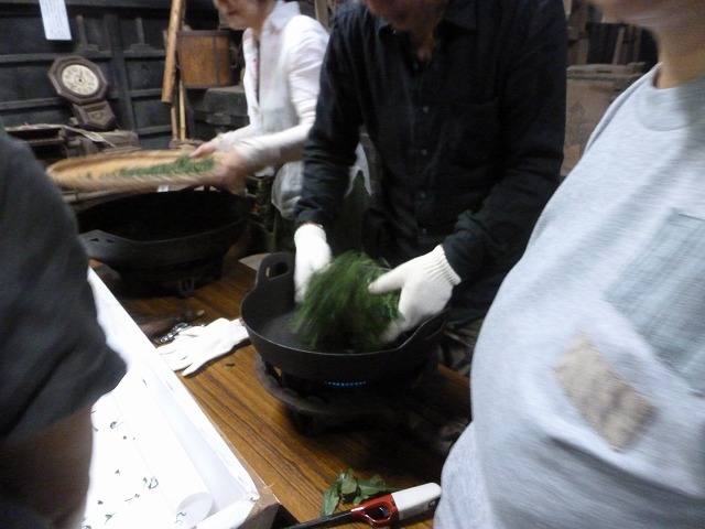 裏の茶畑の在来葉の二番茶を摘んで,釜炒りで製茶をしました。