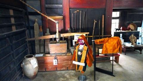 ▼ドマには代官所の火消道具一式が展示されました。竜吐水、水鉄砲、鳶口、手前に