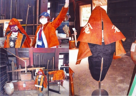 飾られているのは防火コートです。コートには山口家の家紋「片葉折れの茶の実紋」