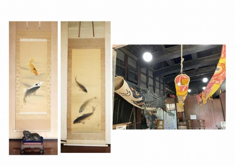 ▼主屋ドマの大空間に泳ぐ鯉たちと、殿様の部屋と宮様の部屋の床の間で泳ぐ鯉たち
