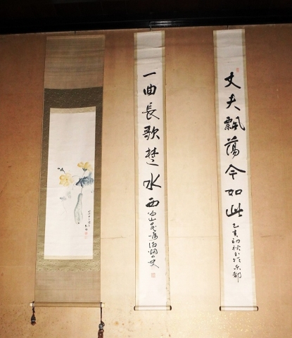 ▼同じく奥座敷の床の間には中島湘烟(しょうえん)の掛軸・3軸が展示されて